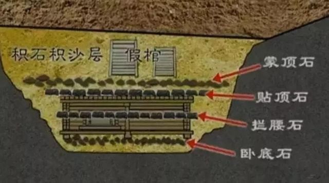 假如上述办法还不收效,该墓的最具特征的积沙积石就该显威了。它的填土层有11米厚的积沙,估量有3000立方米以上,流动性很强;积沙层中还发现了1000多块积石,最大的重165公斤。盗洞挖到这一层,积沙积石都可以把其源源不断地将盗洞填满或砸塌。其间一个盗洞用木板建起了巷道,挡住了流沙,但没挡住巨石,在快要成功时仍是被巨石给砸塌了;还有一个盗洞绕到墓室下方“地攻天”,妄图绕过流沙巨石,但仍是没有成功。